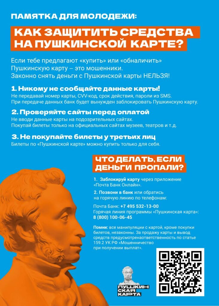 Пушкинская карта относится к социальным картам, на которой хранятся бюджетные деньги. За передачу карты третьим лицам предусмотрена административная ответственность.