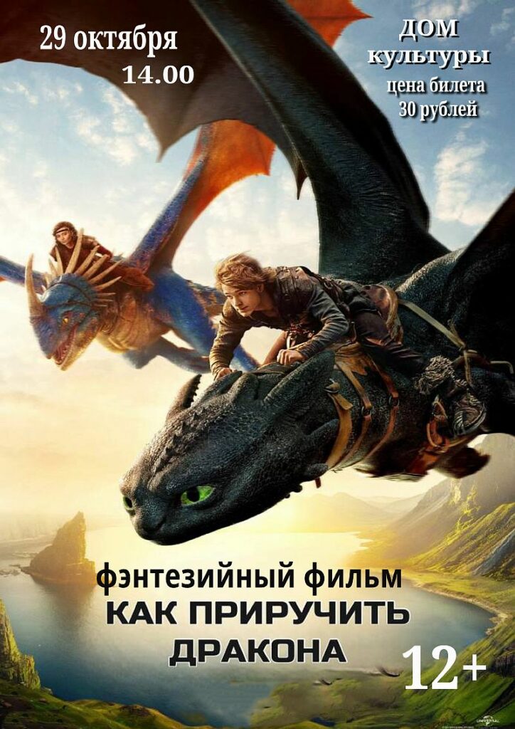 29 октября в 14:00 приглашаем вас в захватывающее путешествие вместе с любимым фэнтезийным фильмом «Как приручить дракона»! Откройте для себя мир викингов, отважных героев и, конечно же, невероятных драконов.